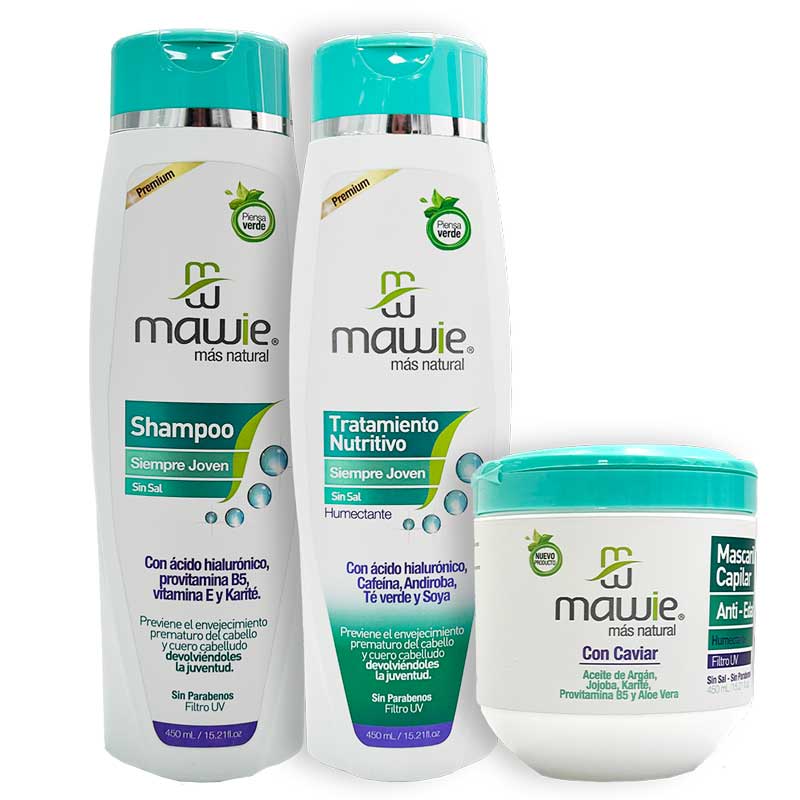 Nuestra Línea Premium Siempre Joven es una línea enriquecida con ácido hialurónico, provitamina B5, vitamina E, caviar, té verde y karité, diseñada para devolver al cabello las características perdidas por procesos químicos o factores ambientales. Su fórmula completa restaura la elasticidad, nutrición, brillo y vitalidad, además de proporcionar hidratación profunda y prevenir el envejecimiento prematuro de la fibra capilar.